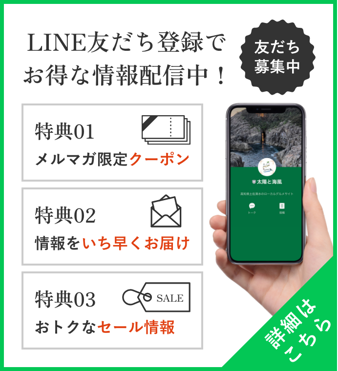 四国最南端高知県土佐清水市。真冬でも雪の降らない温暖な地域で、黒潮が日本で最初に接岸する豊かな漁場があります。そして南国高知、日本有数の日照時間や手付かずの自然が残る清流の水からできる農作物。