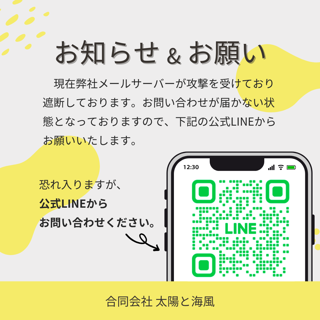 お問い合わせが届かない状態となっておりますので、右記の公式LINEからお願いいたします。